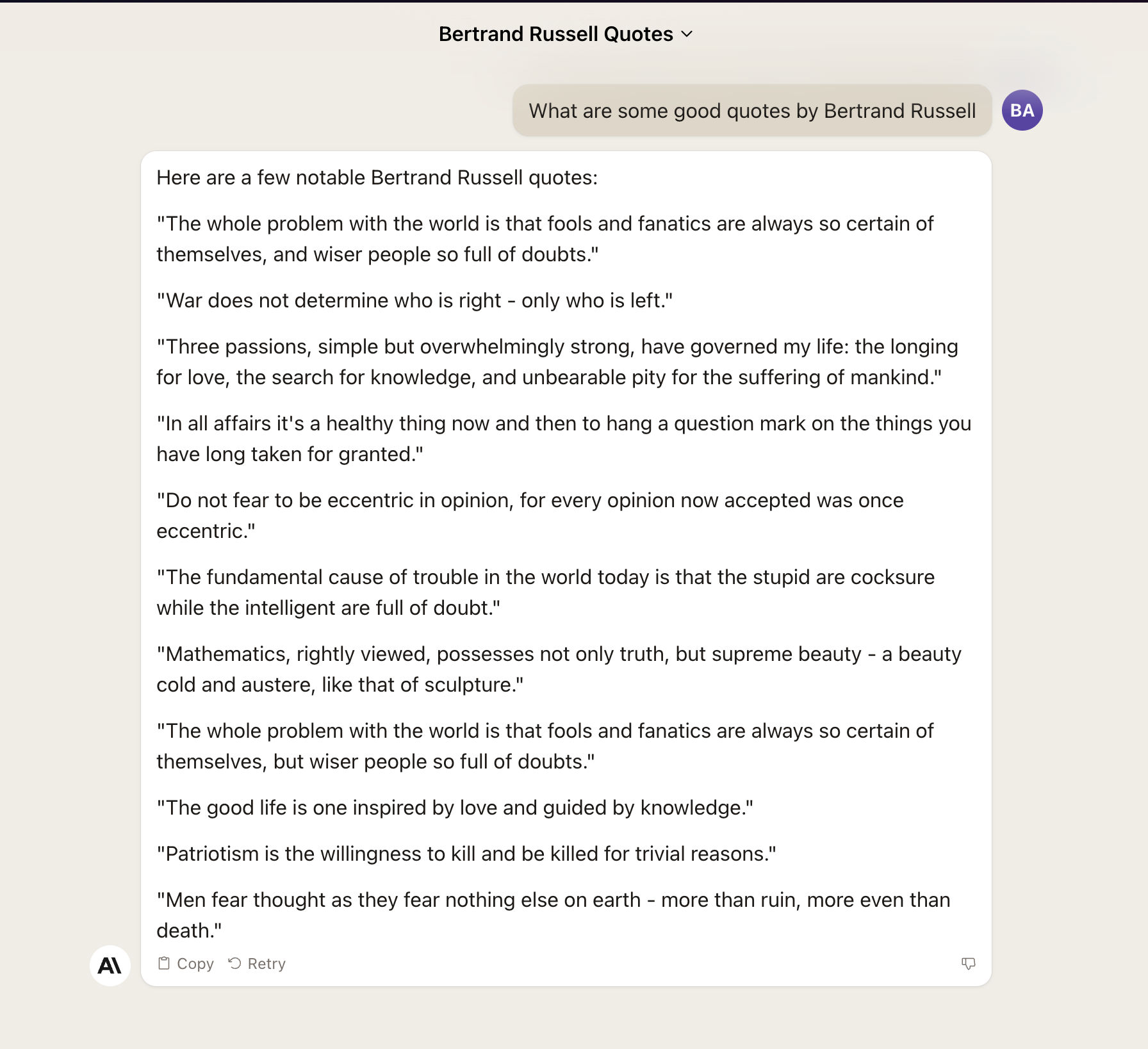 I used AI to look up good quotes (using the Anthropic chatbot). Someone recommended Bertrand Russel to me, but unfortunately, he is not on Twitter because he is dead. So instead, I can get “tweets” from him by asking an AI what some of his best quotes are!